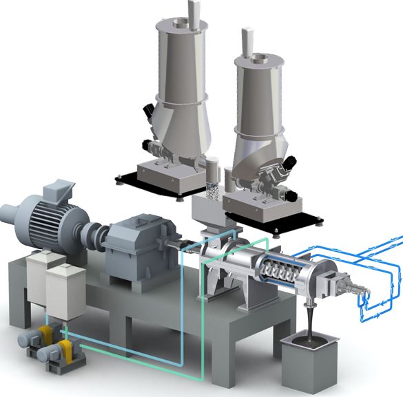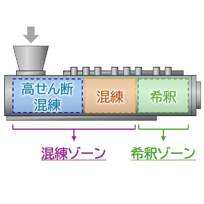 二軸連続式混練機「KRCニーダ」は次の機械特性と混練条件により、混練熱を抑制しながら、二次凝集物を解砕できます。