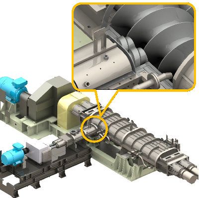 二軸連続式混練機「KRCニーダ」は次の機械特性により、デッドスペースが少なく、 また、大型機種を用いて滞留時間を確保し、顆粒物を十分に溶解することができます。