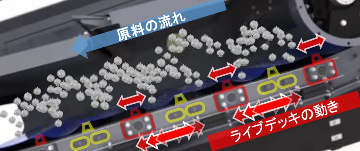 異なる運動をする固定フレームとライブデッキが交互に取付けられていることにより、マットに揺動運動 (フリップフロー)が発生し、原料を巻上げながら篩いを行うので効率的かつ高精度の選別が可能です。